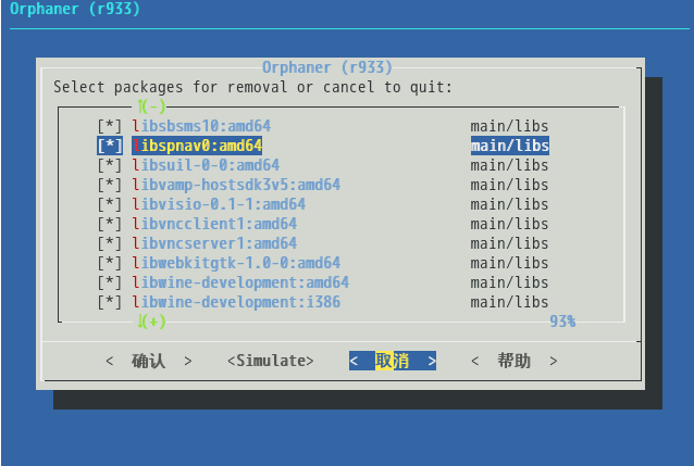 linux在安装软件的时候会安装一些依赖包,在你卸载这个软件的时候他们可能不会被一起卸载掉.当你想要删除这些不用的依赖文件时你会发现你会应为依赖文件太多不能区分那些是有用那些是没有用的,这个时候可以使用deborphan来列出孤立和无用的软件包并选择删除.