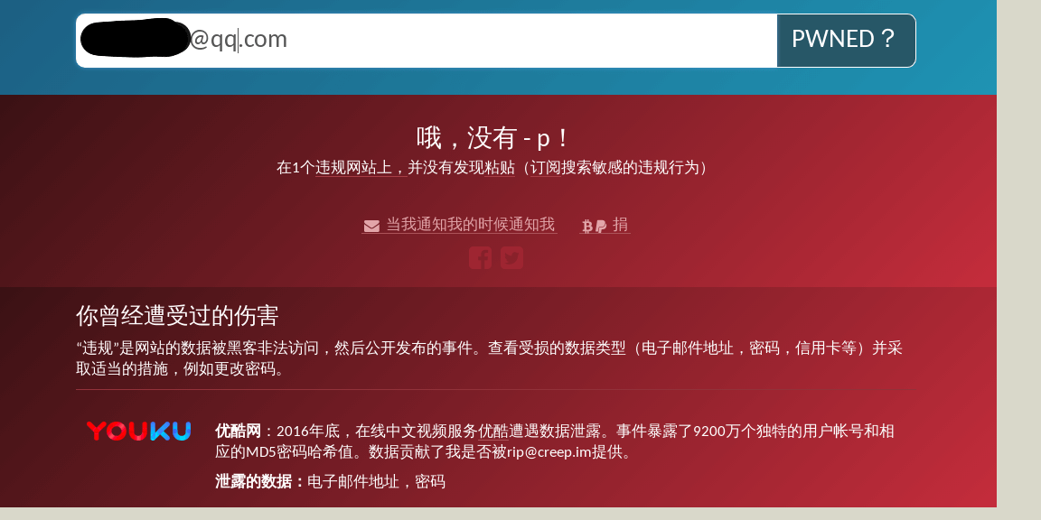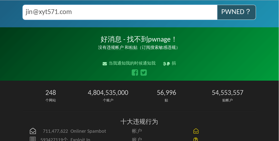 haveibeenpwned是一个可以检测自己的帐号或邮箱是否被黑客窃取过的线上工具。它收录了目前已知的密码泄漏数据,如果你发现自己的帐号出现在了密码数据库中,请立即更改密码。检测结果是绿色的也不代表你的帐号是一定安全的,建议不同帐号使用不同的密码.